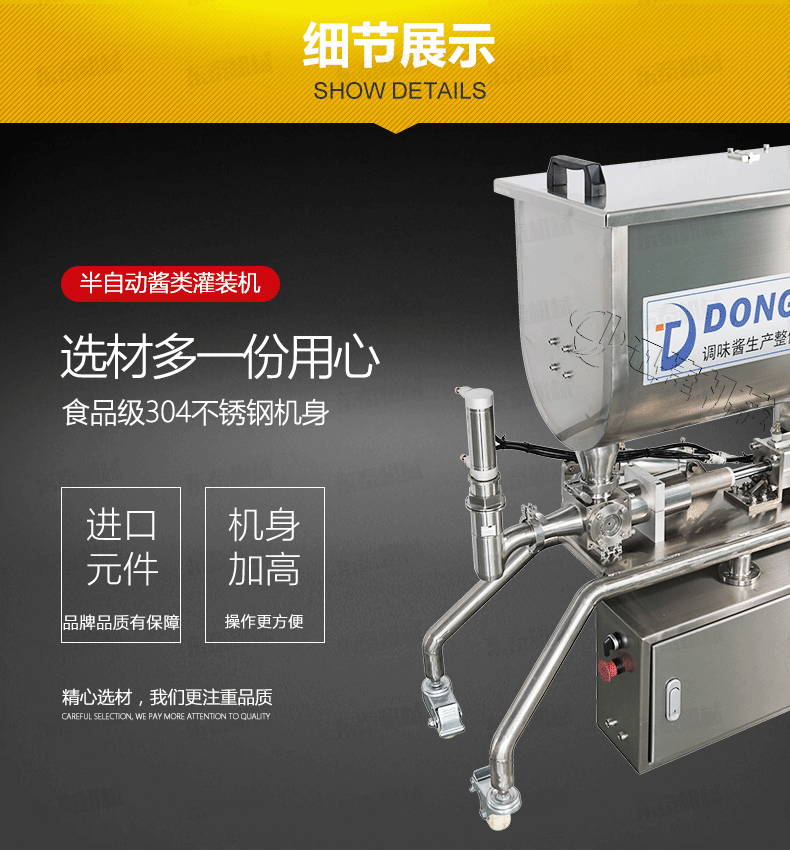 辣椒醬灌裝機 適合于將各類粘稠體及含有各種固體物質(zhì)如辣椒、花生、肉塊、佐料等物體的醬類和油、料分離的火鍋底料等灌裝于各種容器中,辣椒醬灌裝機 適用于辣椒醬、顆粒醬料、大塊肉醬、火鍋底料等的灌裝。辣椒醬灌裝機 /半自動辣椒醬灌裝機可灌裝顆粒漿狀流體物料,特別適用于調(diào)味品中帶顆粒并且濃度較大的辣椒醬、火鍋底料等粘稠醬類的灌裝,配置的自動攪拌器,辣椒醬灌裝機 保證了醬和油的充分混合,又稱為辣椒醬灌裝機、花生醬灌裝機、豆瓣醬灌裝機、果醬灌裝機,芝麻醬灌裝機、粘稠醬類灌裝機、牛肉醬灌裝機。