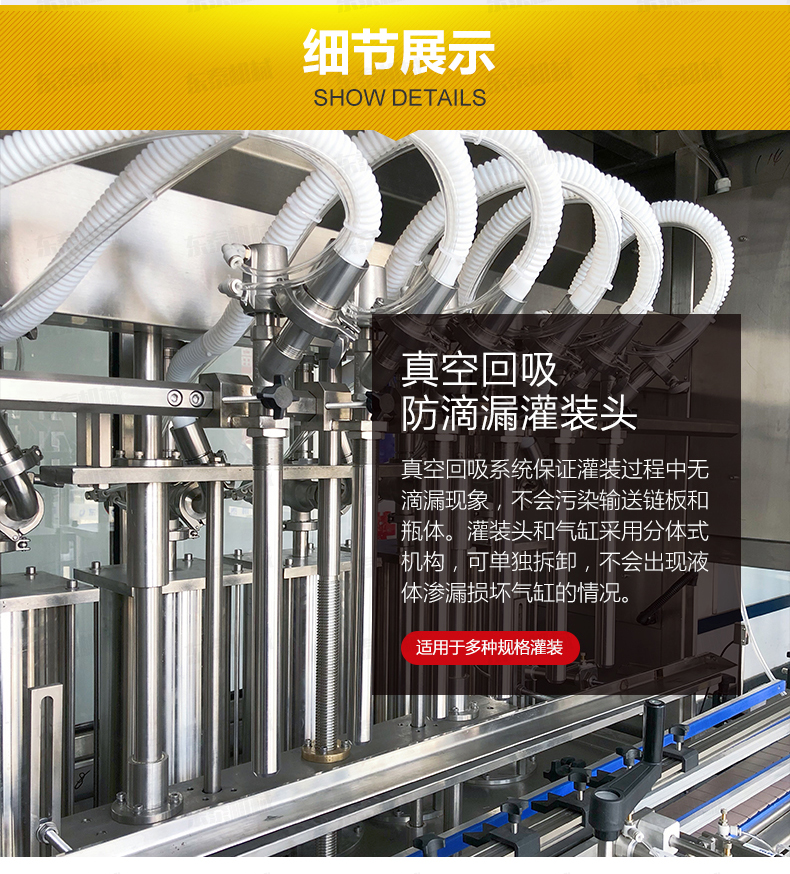 4、灌裝量調(diào)整方便,不需更換零配件,即可適用于不同規(guī)格的瓶子,調(diào)整方便,適應(yīng)性強(qiáng);